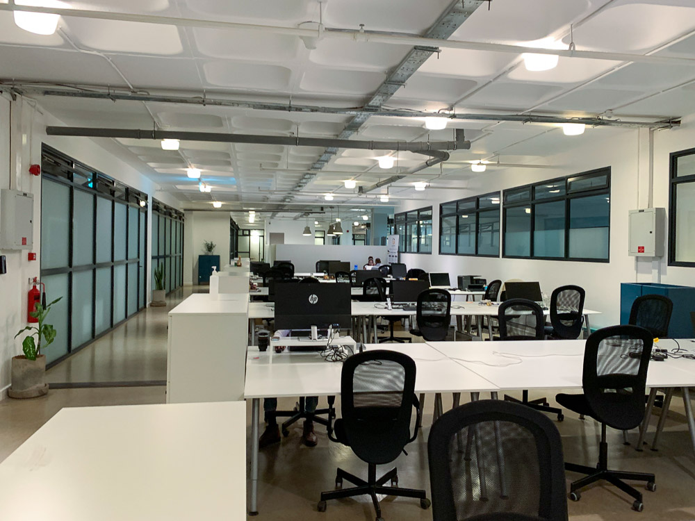 For reference, this is the layout of the co-working space we rent from. One of these table rows toward the back is ours.