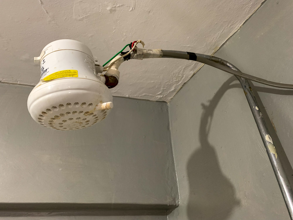 They don’t have hot water heaters, just these shower attachments. That also means no hot water faucets anywhere. And, again, it comes with sketchy wiring with the bonus of being really close to water. Yay.