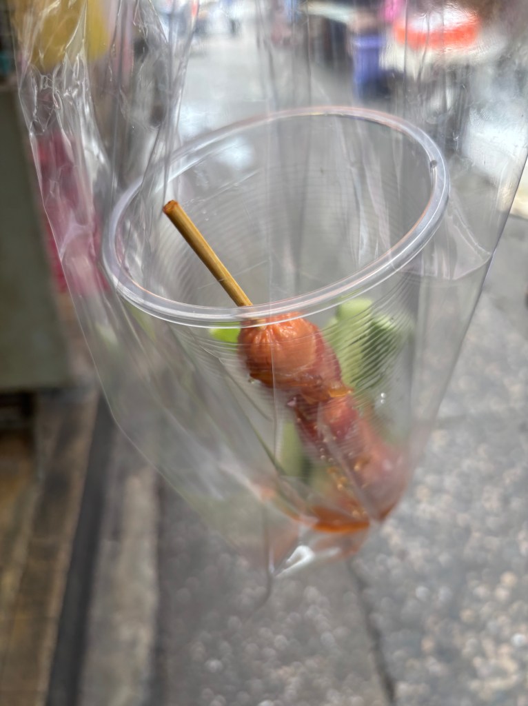 Meat on a stick! The first one: bacon wrapped hotdog.. meh. The second one: grilled pork.. yum. The third one: mystery meat.. yuck. The third one sent me back to the room for a few hours while my stomach decided if it wanted to kill me or not.