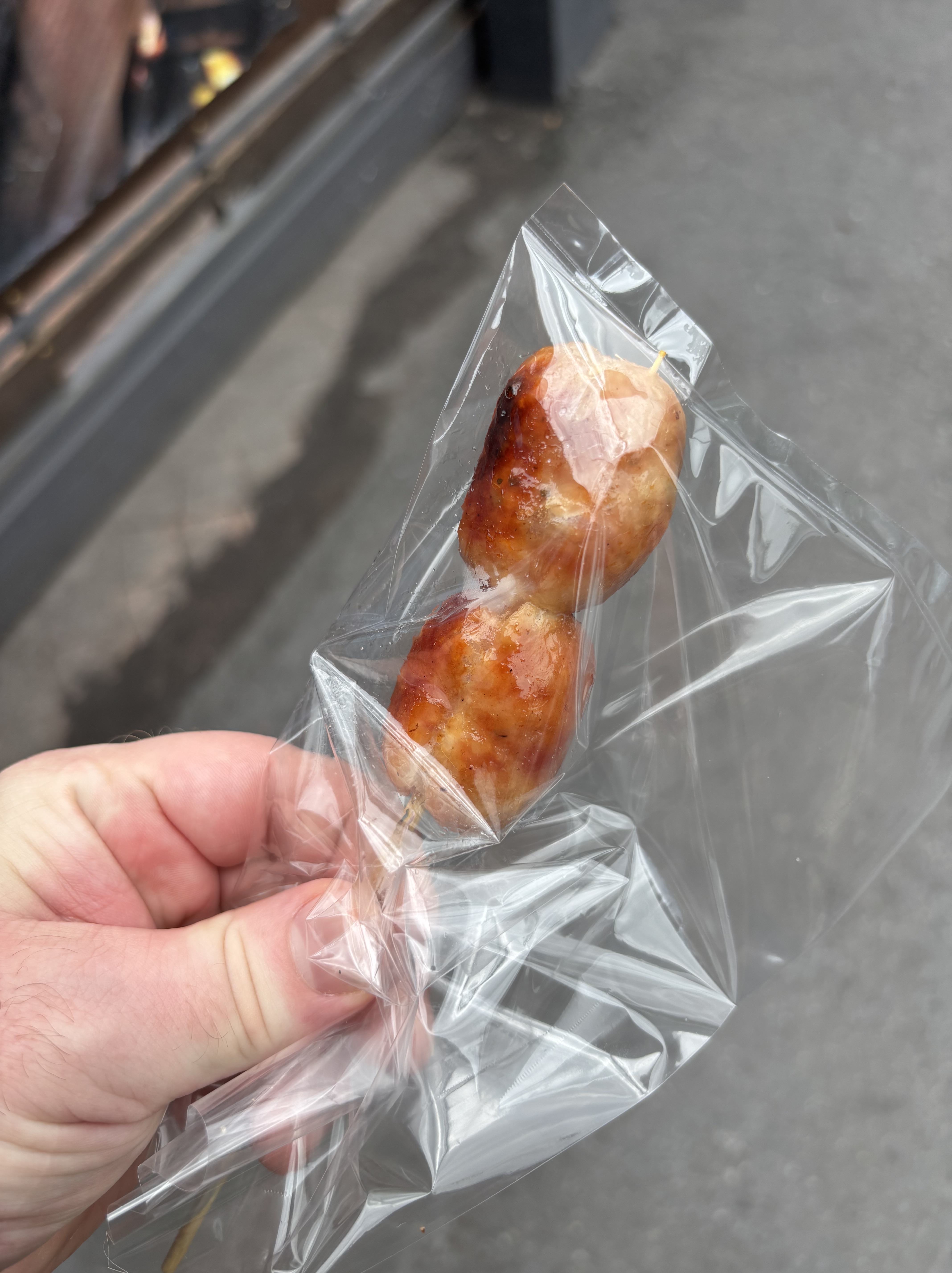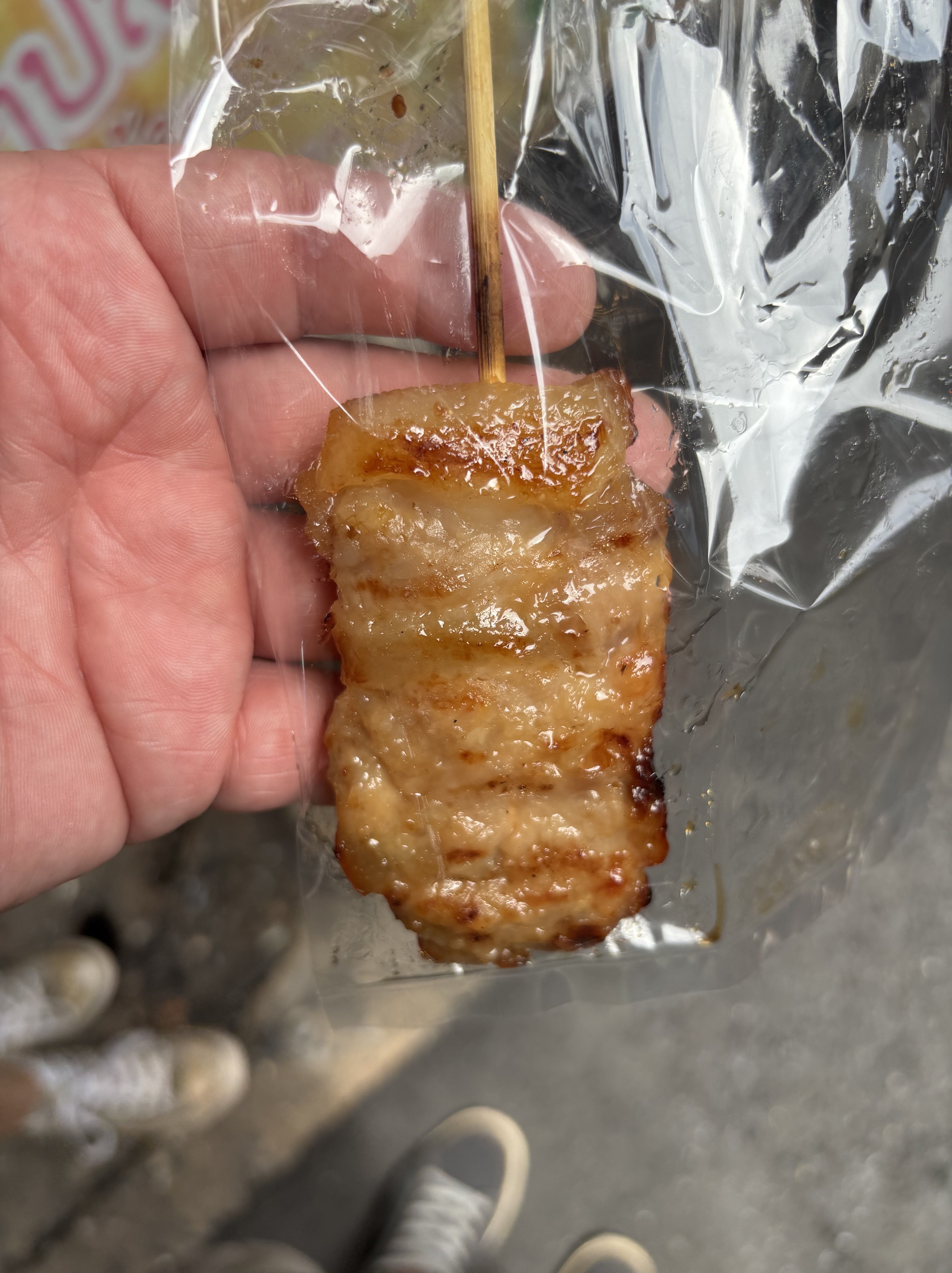 Meat on a stick! The first one: bacon wrapped hotdog.. meh. The second one: grilled pork.. yum. The third one: mystery meat.. yuck. The third one sent me back to the room for a few hours while my stomach decided if it wanted to kill me or not.