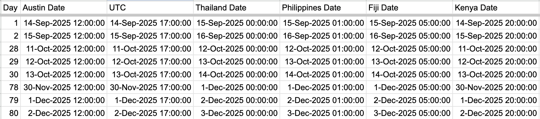 Also I made a timezone-aware timeline to figure out what day it is, from Austin, since I left. I was off by one day from my original thinking, but am now on track to be back in Austin 80 days after I left.