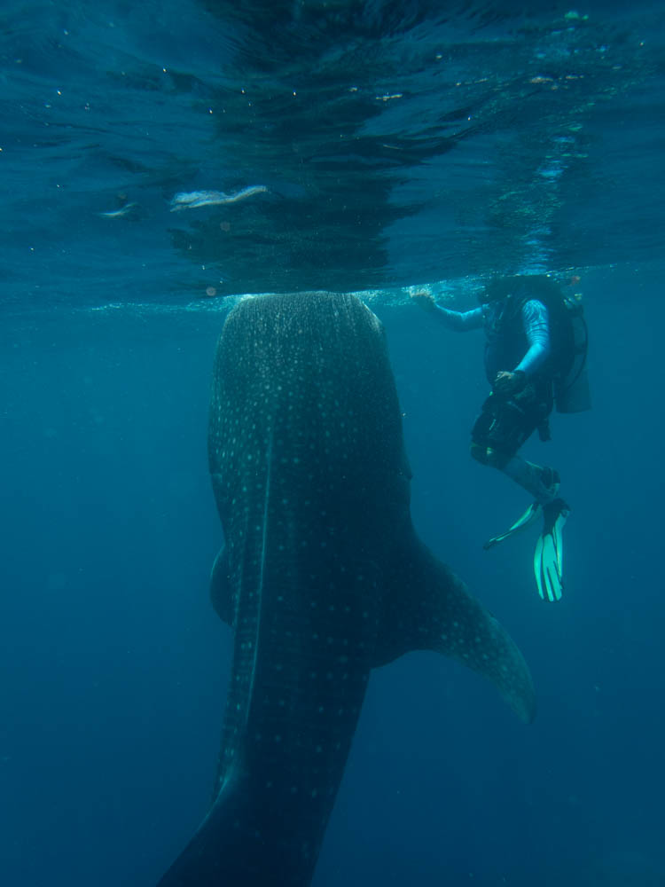 We immediately got underway and went to a place nearby where the locals fed whale sharks. I’ve never seen one before. They go to Kenya a lot, but never at the times I had been there. (Yeah, the divemaster makes for a good size reference in the photo, but he’s too close. They call them puppy-like because they’re gentle and curious. But they’re still BIG!)